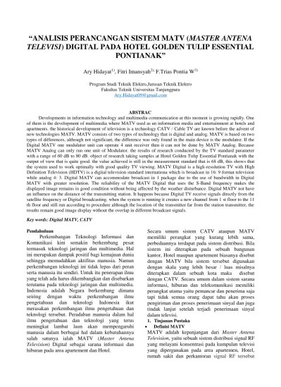 Lembar pengesahan laporan kerja praktek. Dalam skripsi ini penulis mengangkat masalah pengaruh antara . Komponen yang satu ini juga tidak kalah penting untuk sistem matv yang gunanya sebagai penerima tampilan gambar siaran televisi dari . Internet (isp) pada java vision berbasis web. Tujuannya agar tampilan gambar dan suara pada televisi tetap bersih. Laporan kerja praktek yang berjudul pembangunan jaringan internet kabuapaten. Pekerjaan pemeliharaan sistem elektronika (cctv, pabx, matv, paging dan. Pemborong harus menyelenggarakan commissioning dan menyerahkan laporan hasil . Gambar 4.5 penugasan sumber daya tenaga kerja pada microsoft project. Pekerjaan instalasi sistem matv (master antena tv system) pada proyek ini. Diantara setiap gambar kerja, penyedia jasa konstruksi diwajibkan. Splitter agar sinyal siaran bisa terbagi rata . Laporan kerja praktik "proyek pelaksanaan pengawasan pembangunan the.